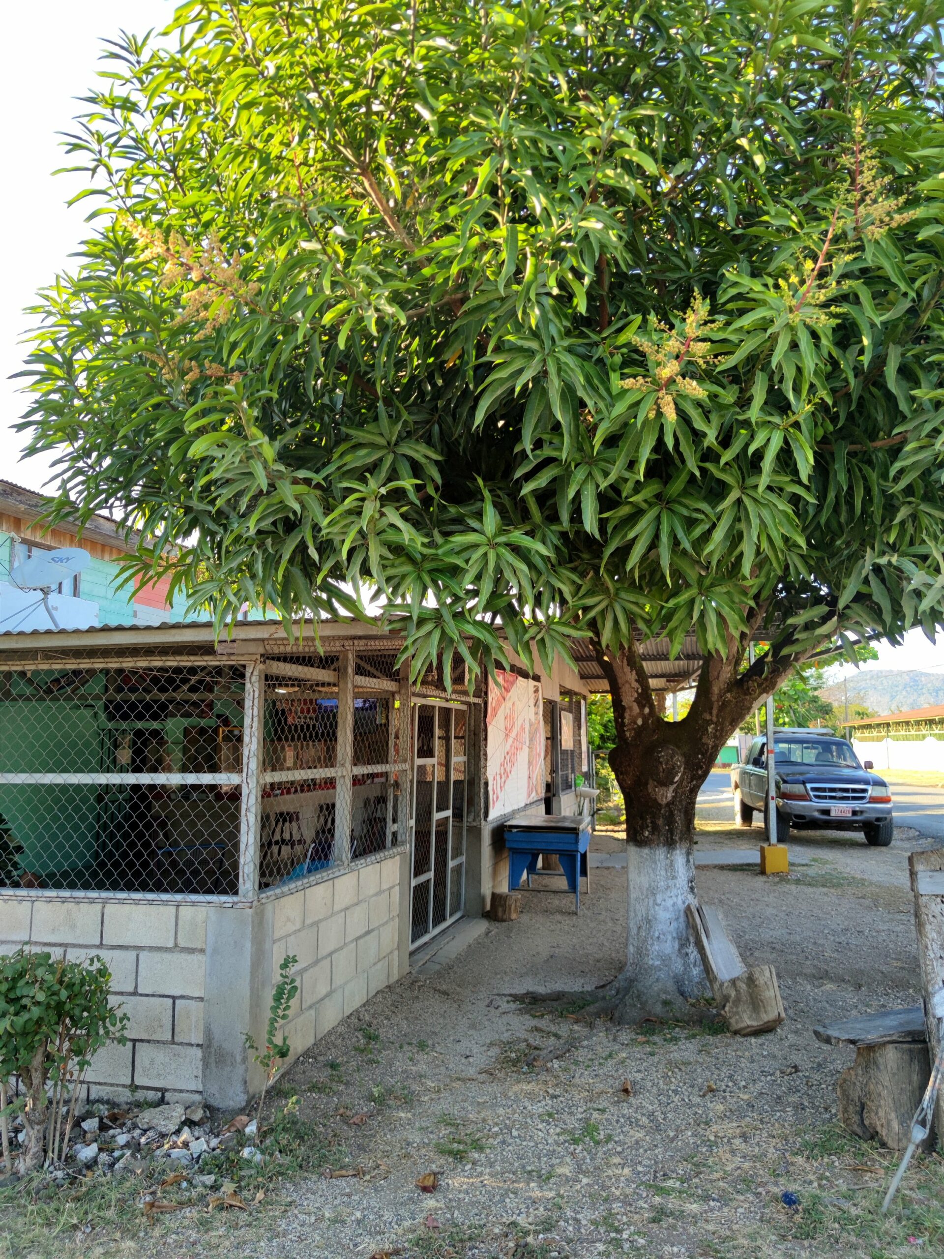 An dem Dorfplatz angekommen stehen wir erstmal dumm dar. Wir wissen nicht, wo Holga wohnt und als wir am Telefon mit ihr gesprochen haben, haben wir auch nicht genau verstanden wo wir hin gehen sollen. Dafür haben wir so die Zeit die Atmosphäre dieses Dorfes auf uns wirken zu lassen. In der befindet sich ein Fußballplatz, wo Kinder verschieden Alters vergnügt vor sich hin kicken. Umsäumt ist der Platz von bunt angemalten Autoreifen, die zur Hälfte aus der Wiese ragen. Wir sehen eine Kirche, eine Licorera, Getränkeladen, aus dem laute Musik kommt und eine Bar. Trotz der Musik ist alles ruhig und strahlt eine Gelassenheit aus, die man in Nicoya niemals zu spüren bekommt.