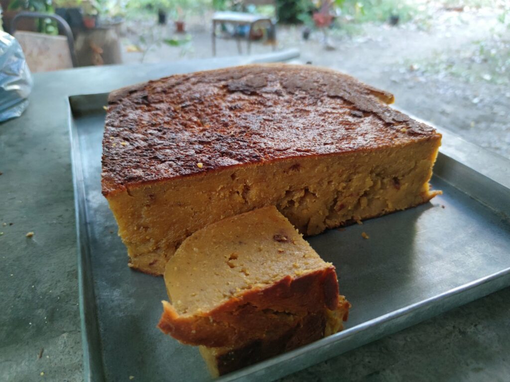 Tamal asado ist eine Art Kuchen mit leicht gummiartiger Konsistenz. Zubereitet wird er auch, wie soll es bei den Mujeres del Maíz auch anders sein, mit Maismehl und Dulce, also Zucker. Genau gesehen habe ich noch nicht wie es hergestellt wird, aber Holga hat mir erklärt, dass die Masse über dem Feuer erhitzt wird und man sie so lange verrührt bis sie die gewünschte Konsistenz hat. Dann kühlt sie aus und kann zugeschnitten werden.
