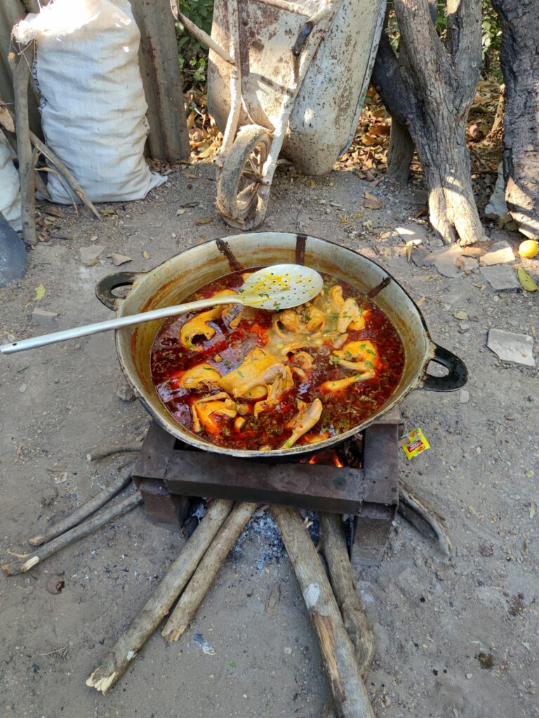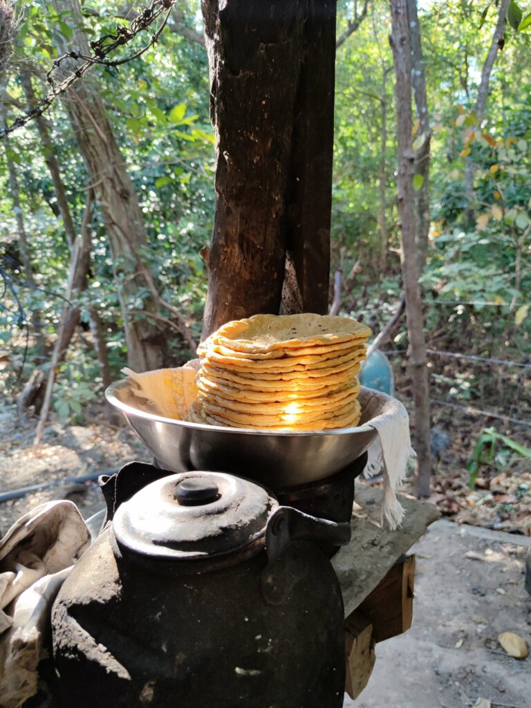 Am nächsten Morgen geht es um 4 Uhr los. Nach und nach trudeln die Frauen ein, sodass wir gehen 4h30 zu siebt sind. Fred und ich helfen bei schnippeln, während die Frauen das Hühnchen und die Masse für die Tortillas vorbereiten.