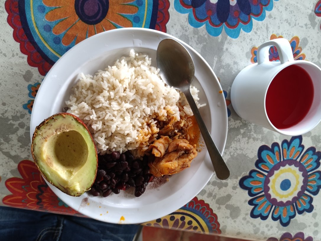 Es wird früh aufgestanden und sich mit eiskaltem Wasser gewaschen. Dann gibt es Reis und frittierte Plátanos zum Frühstück, dazu einen heißen Kaffee mit Zucker. Um kurz nach 6 Uhr geht es zum Colegio oder der Arbeit. Ich wasche das Geschirr während die Großmutter auf Eder aufpasst. Heute sind nur wir zwei da, weswegen ich nicht auf die Finca gehe. Um 10h30 gucke ich bei der Schule vorbei, quatsche mit der Köchin und spiele ein bisschen Fußball mit den Kids. Zum Mittagessen gehe ich runter zum Haus und passe auf das Baby auf während die Großmutter sich ausruht. Dann kommen auch schon die ersten Familienmitglieder aus der Schule zurück. Wir spielen ein paar Runden Dobble und also alle wieder zuhause sind, trinken wir Kaffee und schauen „Das Dschungelbuch“. Danach gibt es Abendessen: Reis, Bohnen und Hühnchen bzw. Ei für mich. Wir tanzen ein bisschen durch die Küche, bis alle um 20h00 Richtung Bett gehen.