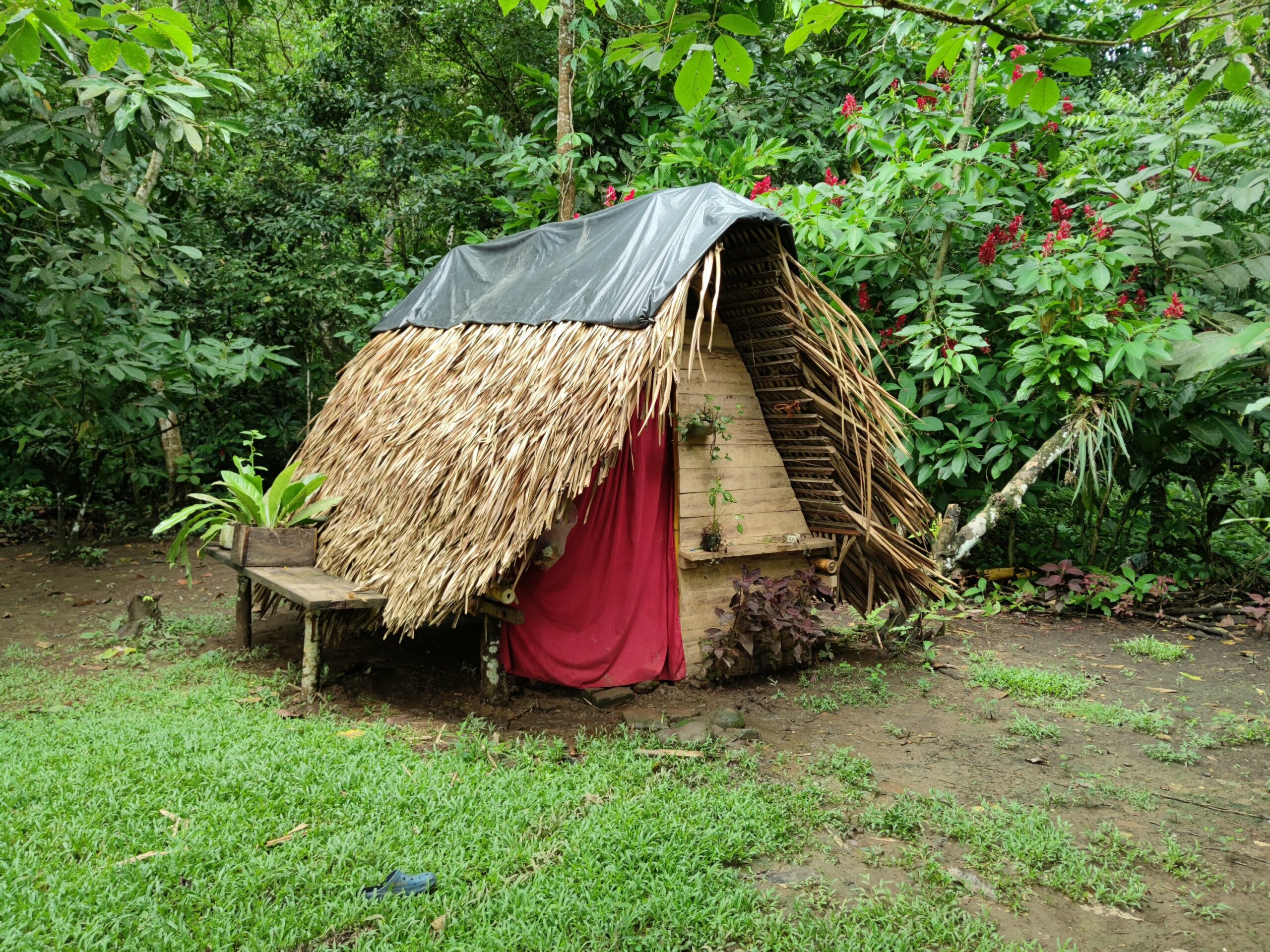 Die Häuser sind eher aus Brettern zusammengenagelte Holzhütte mit Holzboden – super simpel. Das Dach besteht aus trockenen Palmen und oben auf der Spitze eine Plastikplane oder Wellblech. Geschlafen wird auf Holz mit einer Decke drüber. Mit etwas Glück hast du eine fingerdicke „Matratze“, durch die man trotzdem alles spürt. Die Küche ist ein separates Holzgestell mit Dach, an den Seiten offen. Es gibt eine Feuerstelle, ein Waschbecken, ein langes Brett als Tisch und das selbe als Bank. Ansonsten sieht es eher mau aus mit den Sitzmöbeln: zwei Hängematten, ein halber Stuhl, ein leerer Gaskanister und ein Hocker. Die Dusche ist eine kleine Kabine mit Wasser aus einem Hahn, was man sich mit einer Schale übergießt. Das Klo ist ein Loch im Boden.